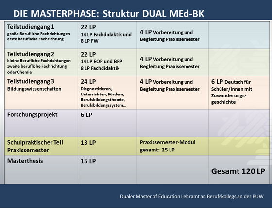 Im Masterstudium Dualer M.Ed.-BK werden zwei berufliche Fachrichtungen für das Lehramt an Berufskollegs sowie Bildungswissenschaften studiert.